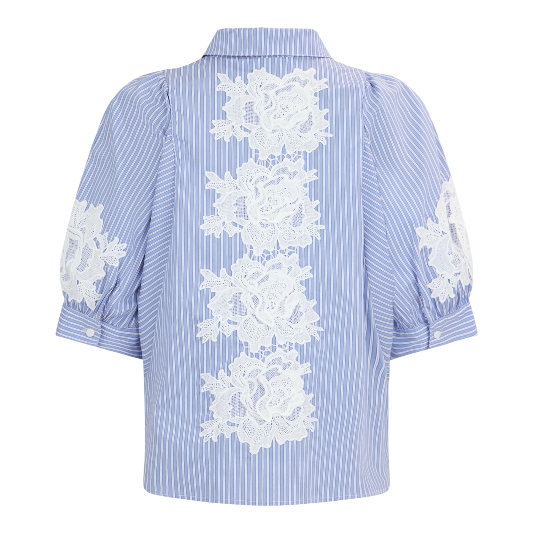 Oversized cotton mix blouse with wide three-quarter sleeve. Blue and white striped fabric with stunning white applique detail at sleeves, front and back. Button down style, with smart collar. Lovely fresh blouse for Spring which will look great with white jeans or crops.
