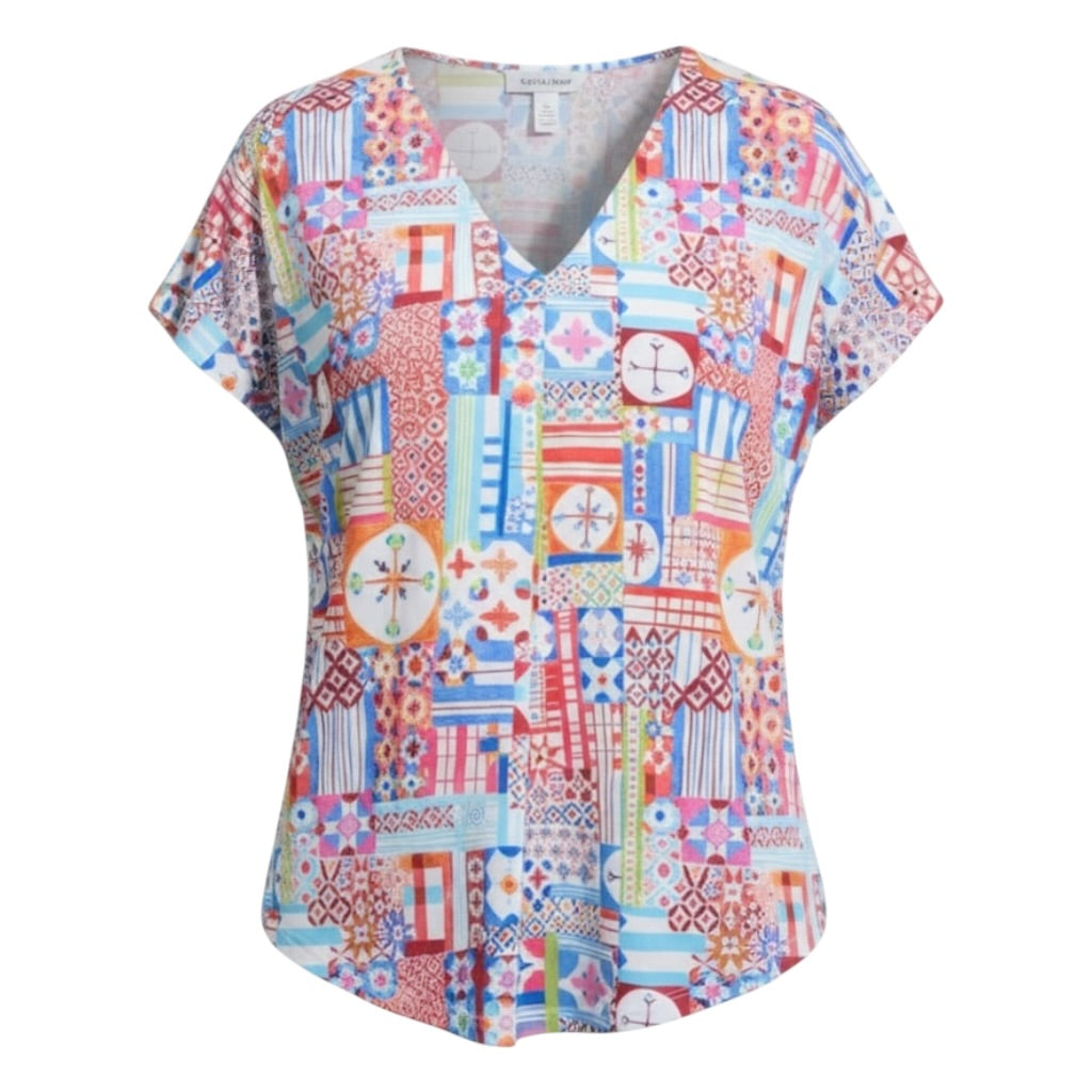 The Tinta Style Mery Patterned Blouse in Multicolour is a perfect way to add a burst of colour to your everyday outfits. This Tinta Style top is designed with a striking patchwork print in vibrant summery colours. This top features a flattering V-neck with a pleat down the front, cap sleeves, a rounded hem and a relaxed fit which drapes beautifully.