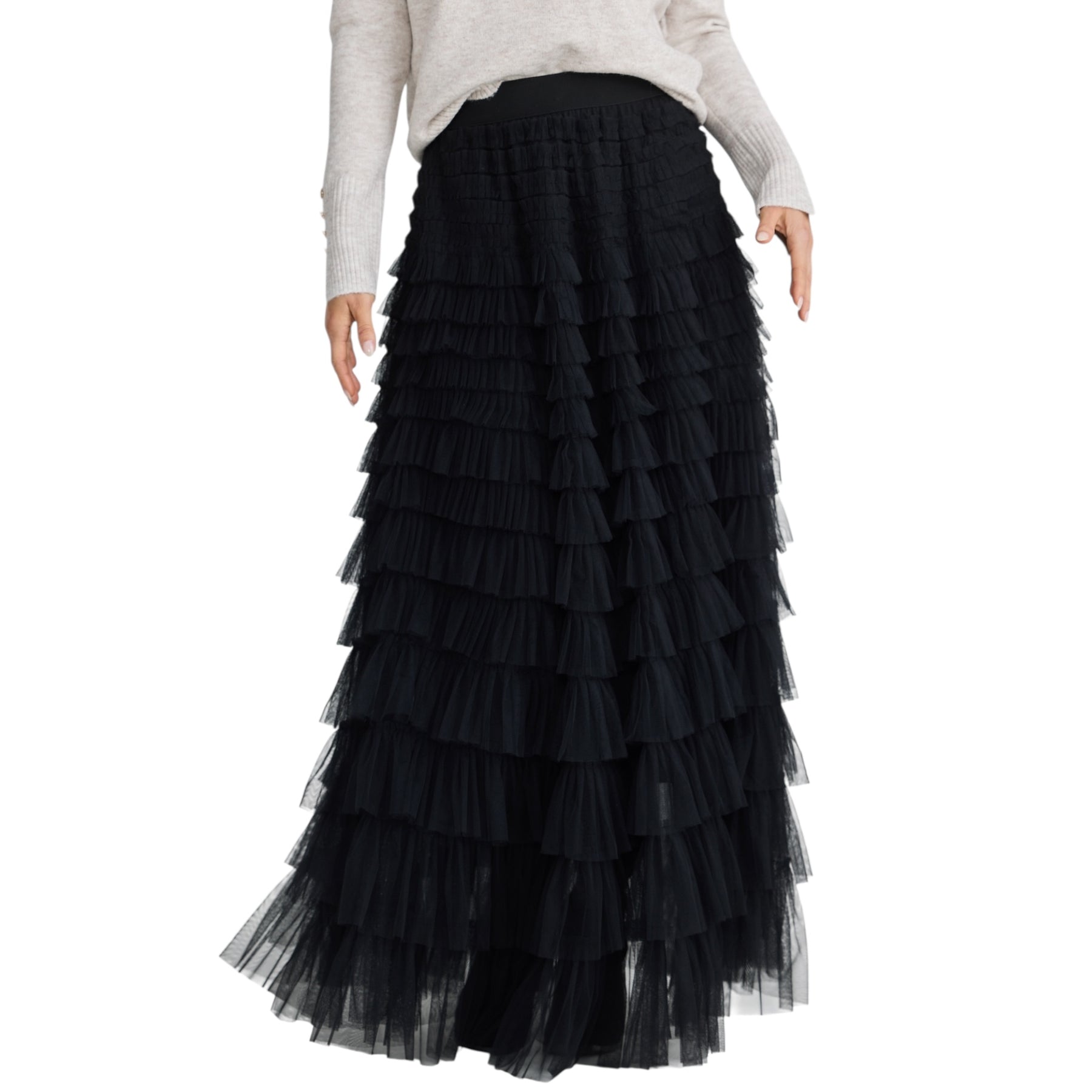 The Brave+True Chance Skirt in Black is a stunning skirt made up with layers of soft black tulle. This Brave+True skirt has an elasticated waistband making it comfy to wear all day/evening long. It features as full length tiered design with makes it work perfectly with knits for a more casual look, or dressed up with heels for the evening.