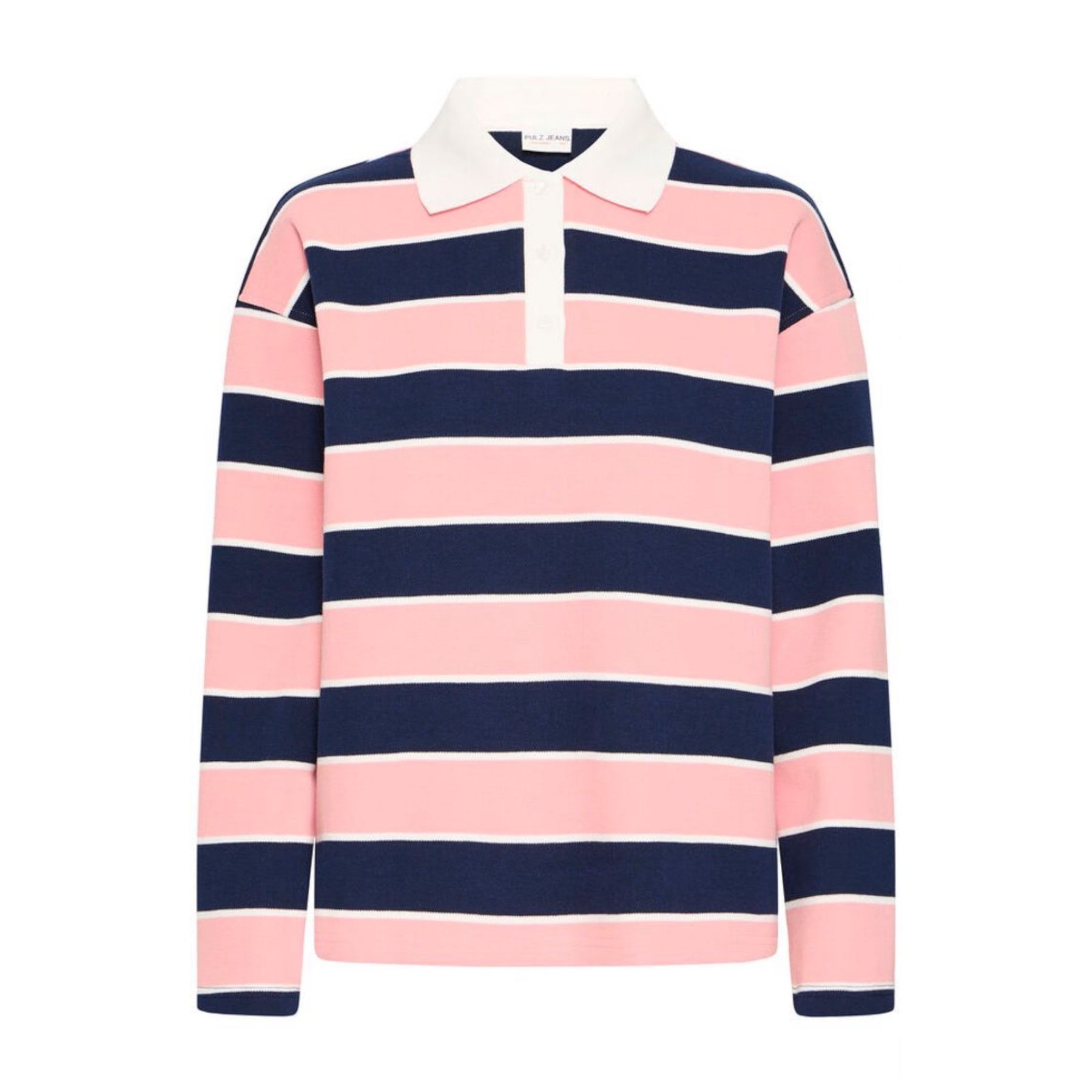 The Pulz Ariel T-Shirt in Navy Rose is a fun rugby style shirt with wide navy and pink horizontal stripes. This top has a relaxed fit ensuring all day comfort whilst still looking stylish. Long sleeved and a button down collar.