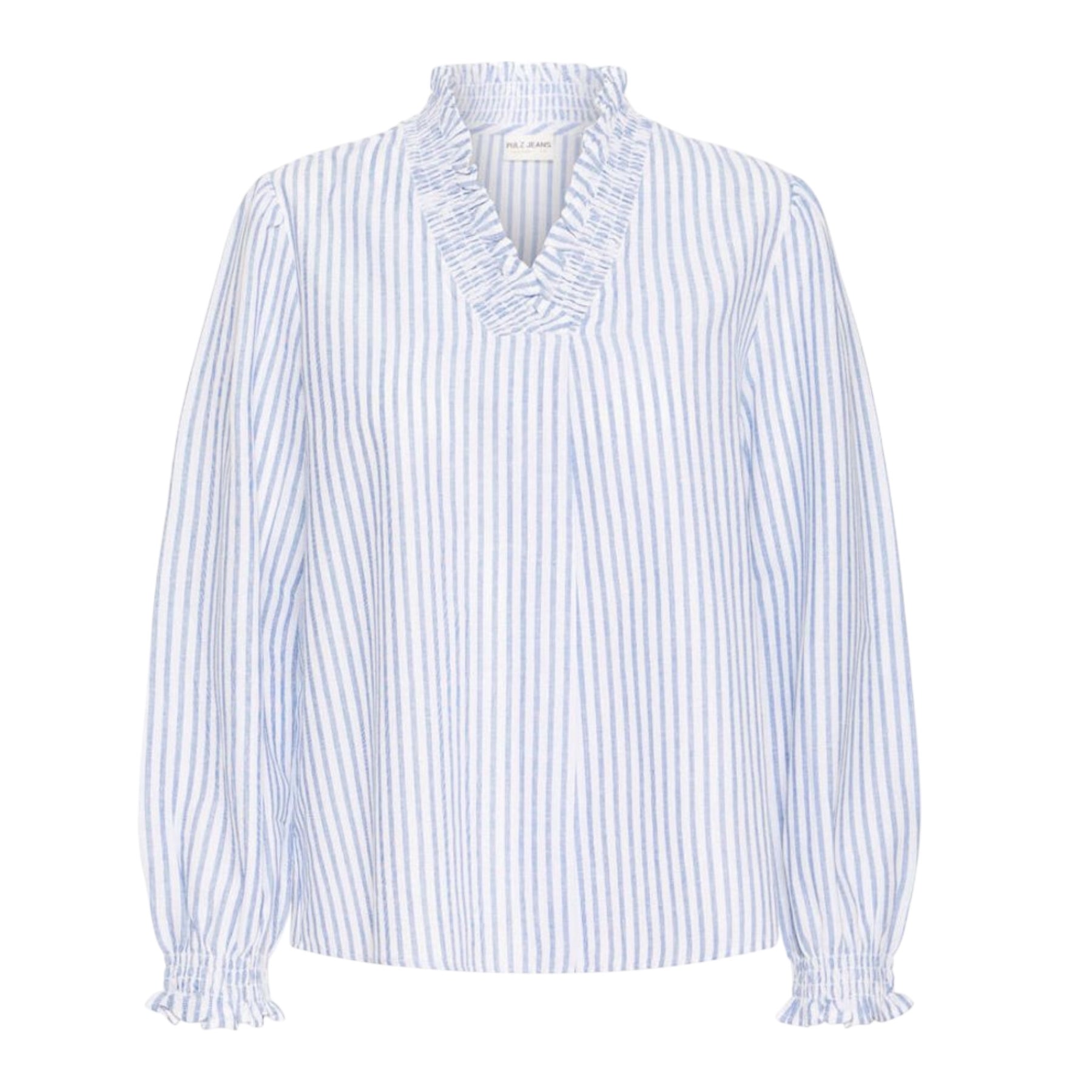 The Pulz Audrey Blouse in Cloud Dancer is a pretty V-neck cotton blouse in a light blue and white stripe for an clasically chic look. The full-length sleeves are finished off with an elasticated cuff creating a flattering shape. An easy to wear and versatile blouse that pairs well with a denim.
