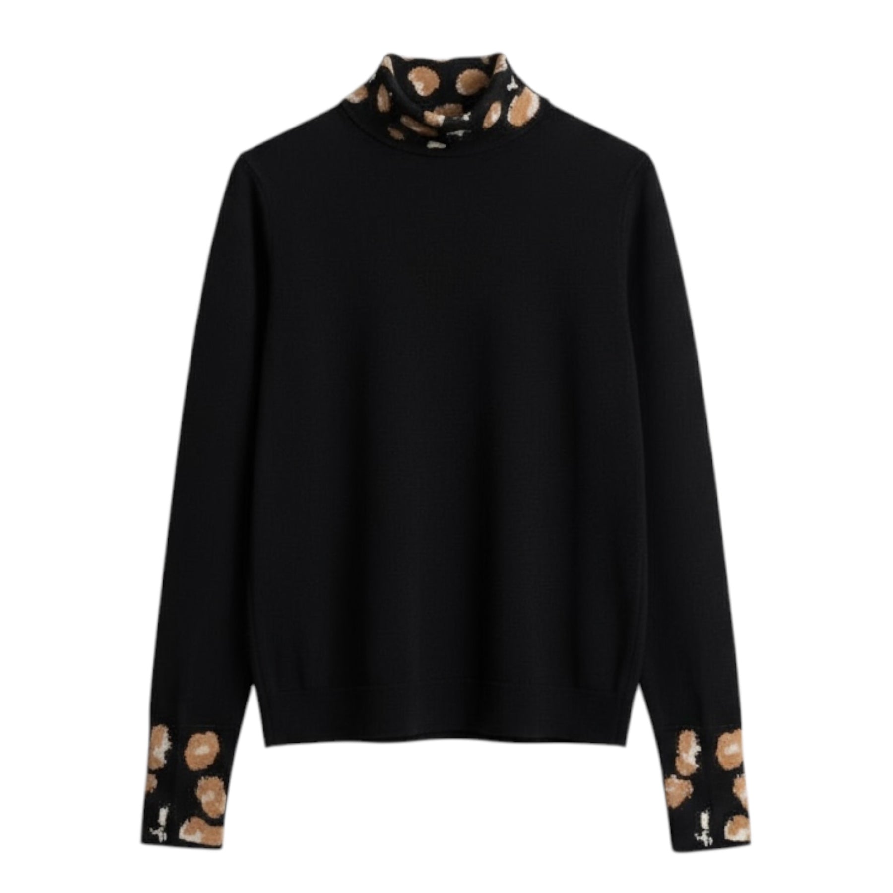 The Tinta Style Italica High Neck Top in Black is a great top for layering this winter.  Classic black polo neck sweater, but brought up to date with contrast animal print at neck and cuffs.  Super comfortable, the body of this jumper in solid black contrasts perfectly with the high neck and sleeves.