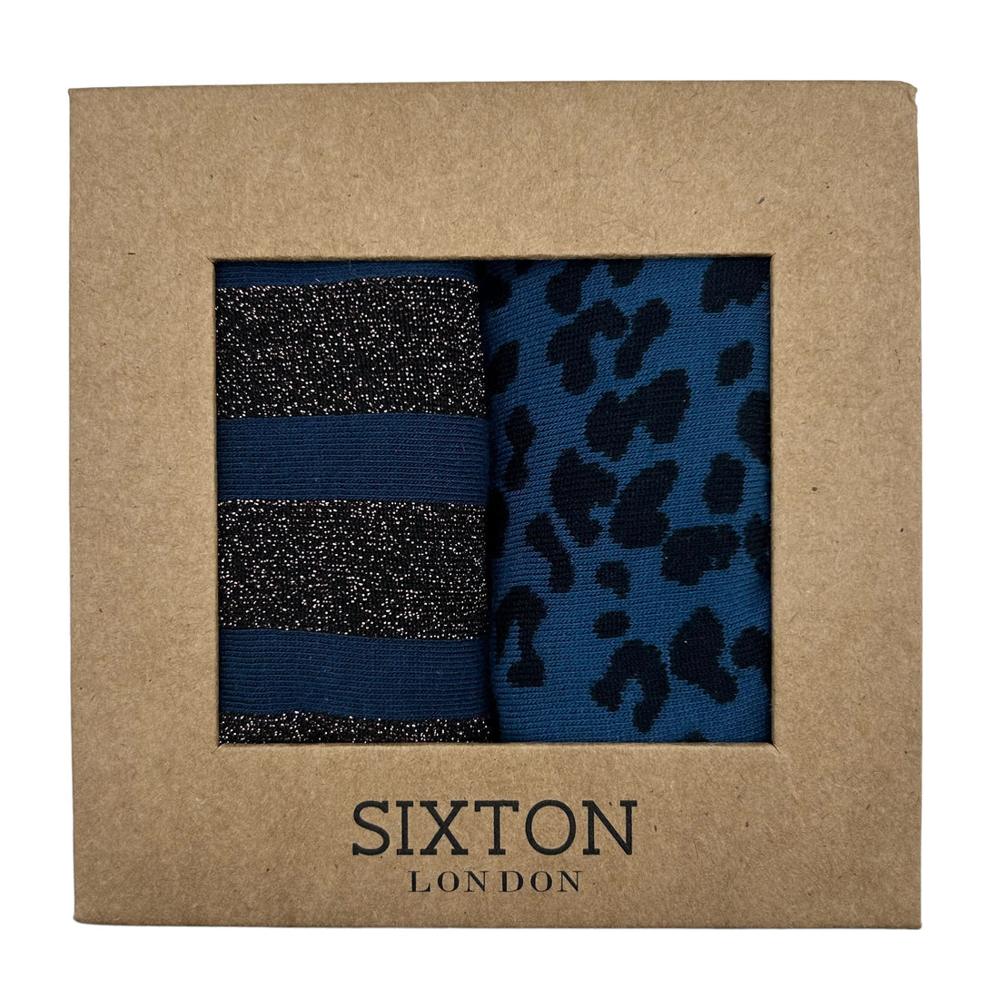 The Sixton London Denim Leopard and Berlin Sock Box Duo are two pairs of socks in a gift box. This box includes a black sparkly stripe and blue sock and a blue leopard print pair. A great stocking filler for Christmas.