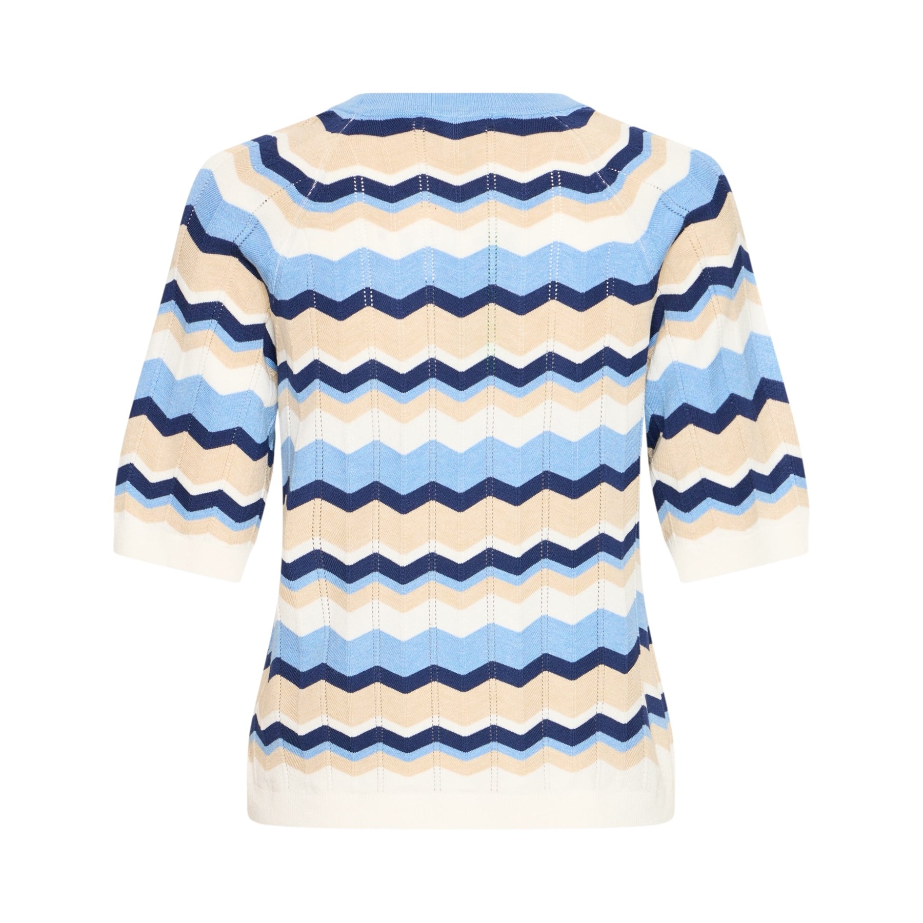 The B.Young Morla Pointelle Sweater in Della Robbia Blue is an effortlessly chic lightweight sweater that features a delicate pointelle knit adding a subtle texture to the classic shape. This sweater has a horizontal zigzag pattern all over in a mix of Blues, Sand and White. With short sleeves and a round neck this lightweight sweater is perfect for layering or for wearing on its own moving into Spring.