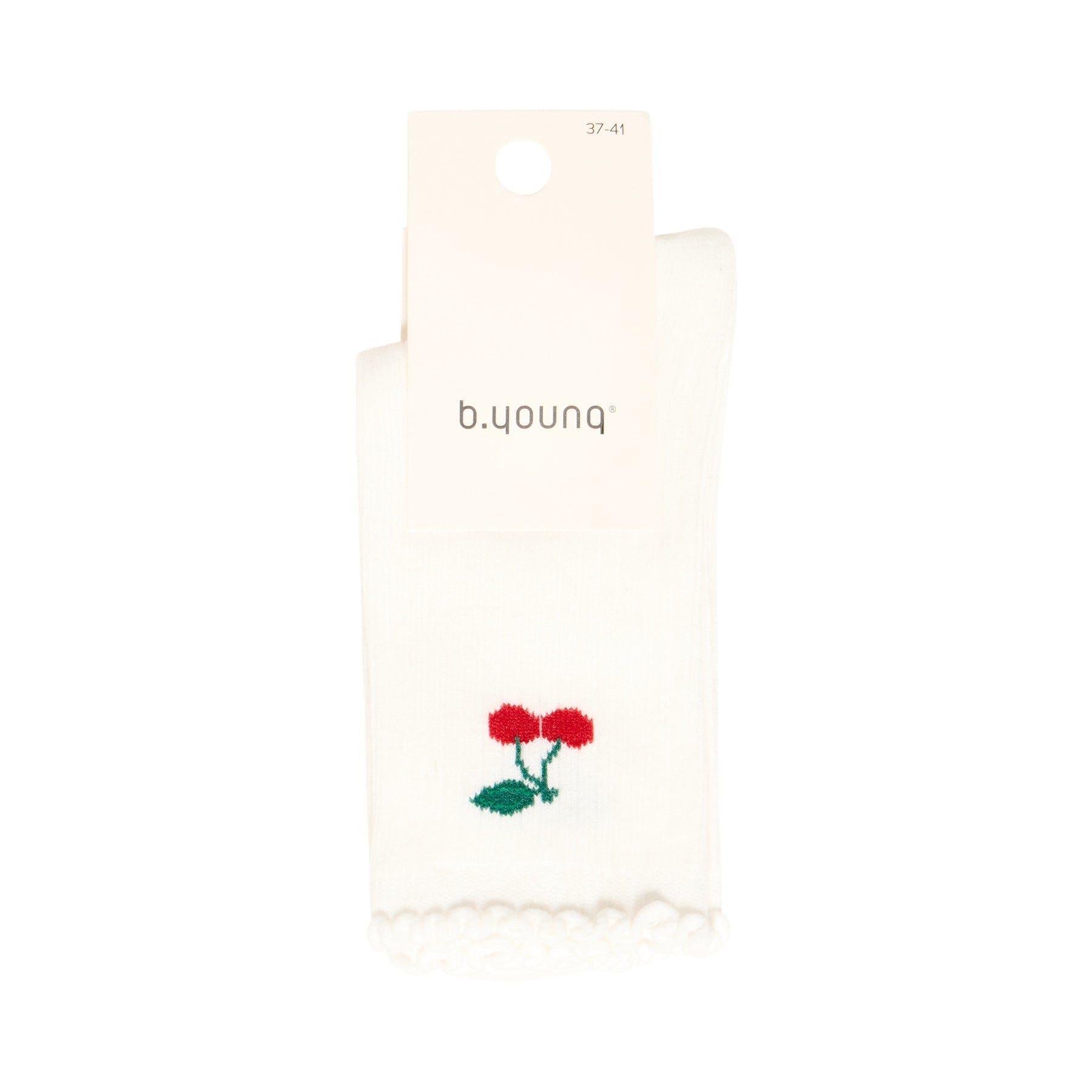 The B.Young Vinyet Socks in Cherry are white cotton socks with a cherry design and a frill at the top. A great little gift or a cute pair of new socks for yourself!