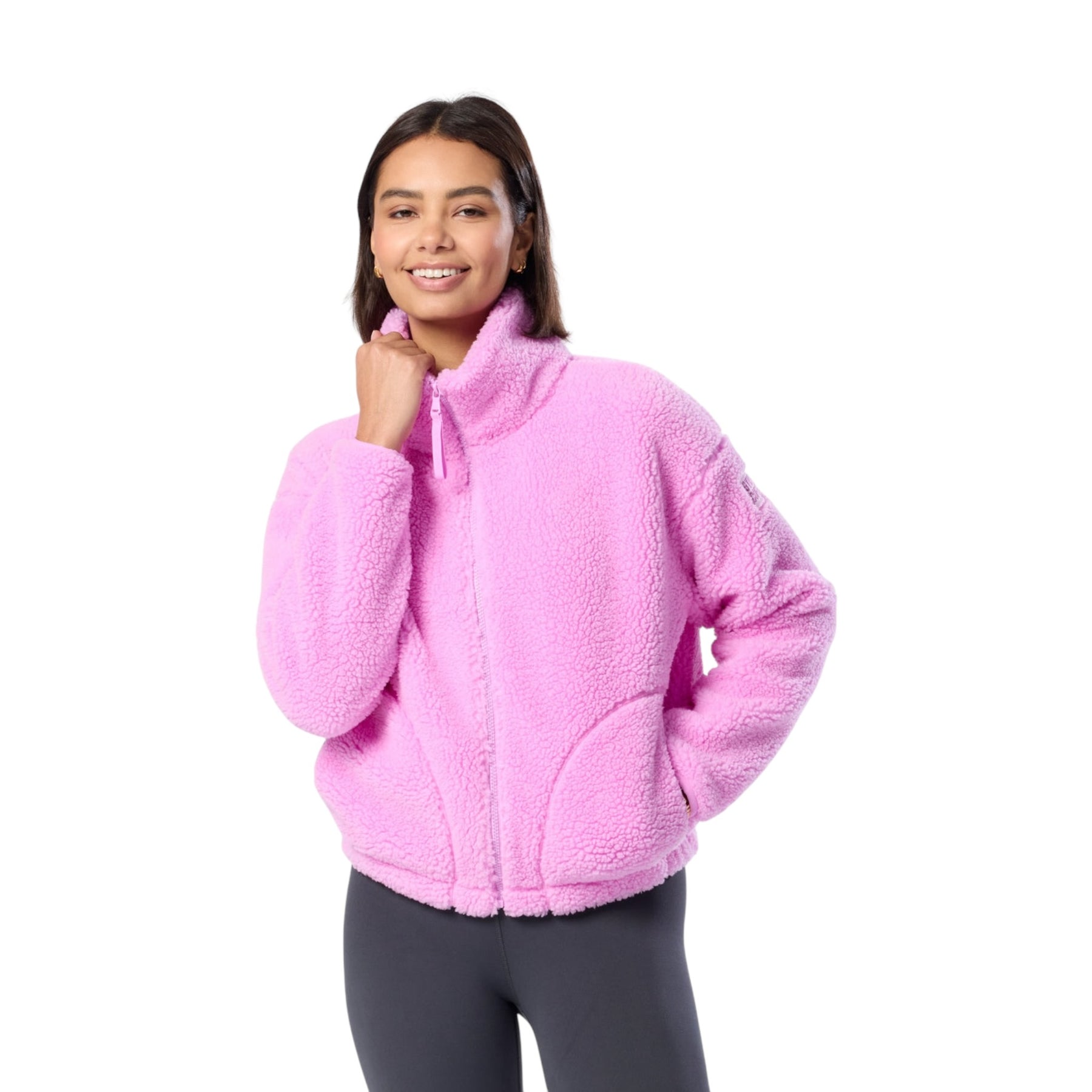 Woman wearing a pink fleece jacket on a white background