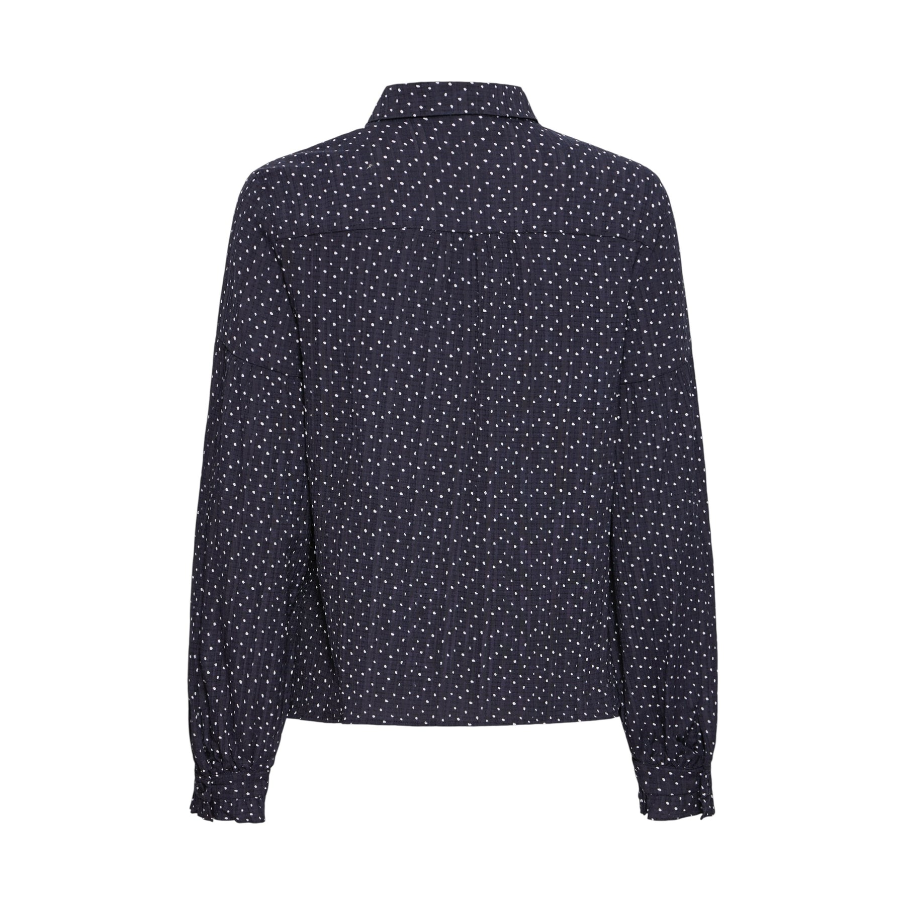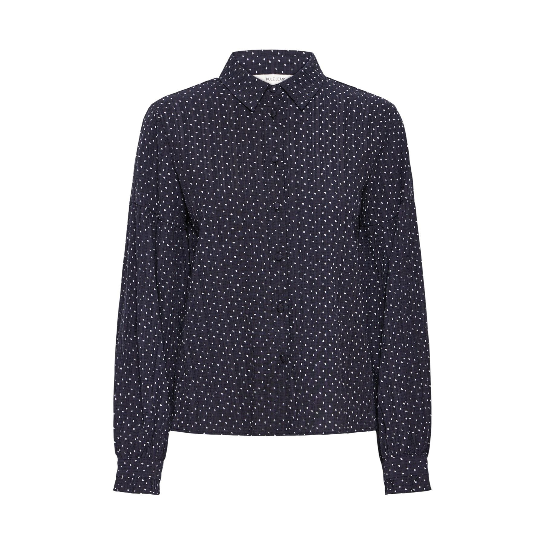 The Pulz Addison Shirt in Dark Sapphire features a crisp white dot print on a dark sapphire background. This Pulz shirt has a pointed collar, a button through front and long sleeves. This shirt is made with a lightweight and breathable viscose mix fabric making it perfect for comfy everyday wear.