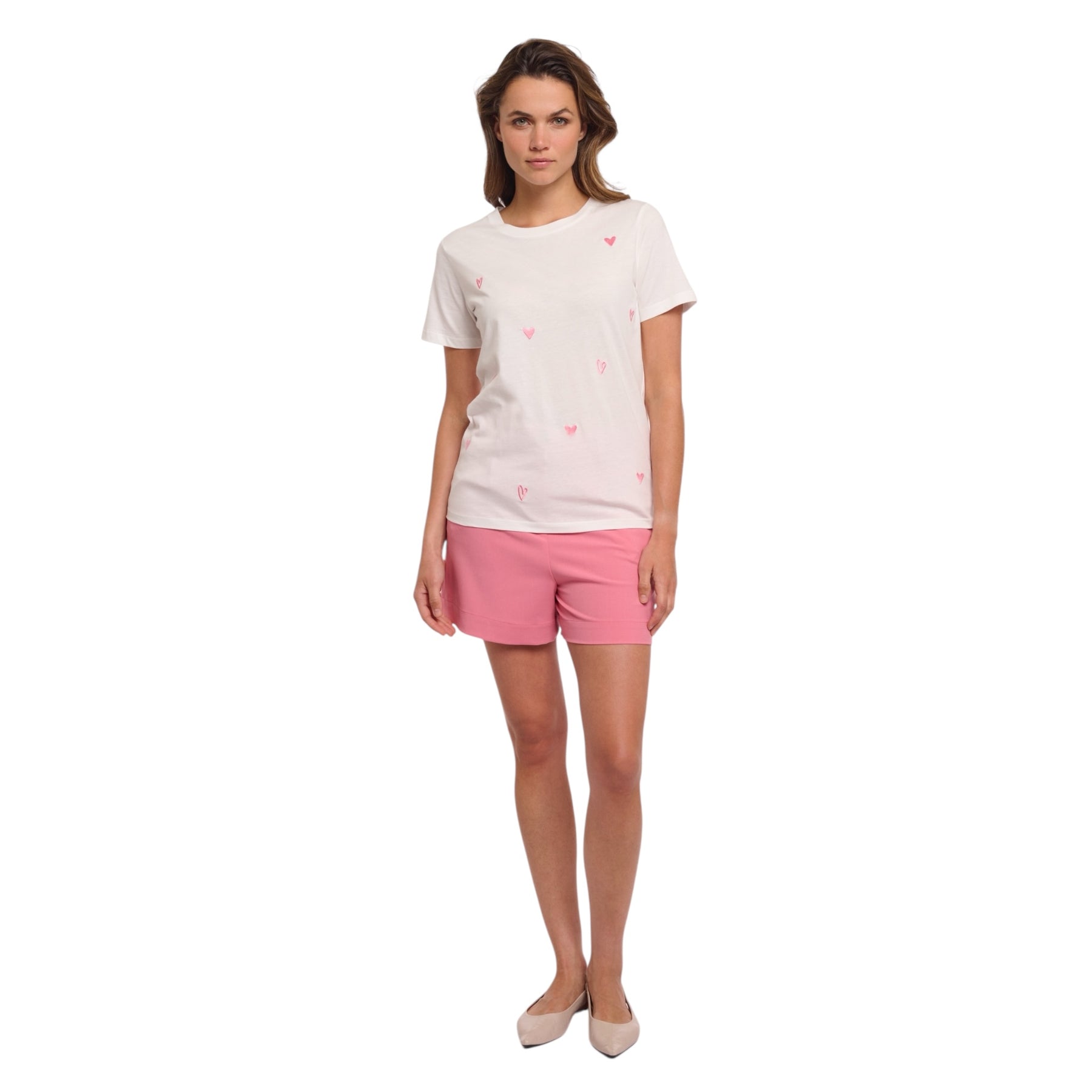 The Rino & Pelle Drea Embroidered Top in Snow White is an effortlessly elegant soft T-shirt, adorned with delicate all-over heart shaped embroidery that adds subtle texture to its clean silhouette. Crafted from a smooth, breathable fabric, it offers everyday comfort with a refined finish.