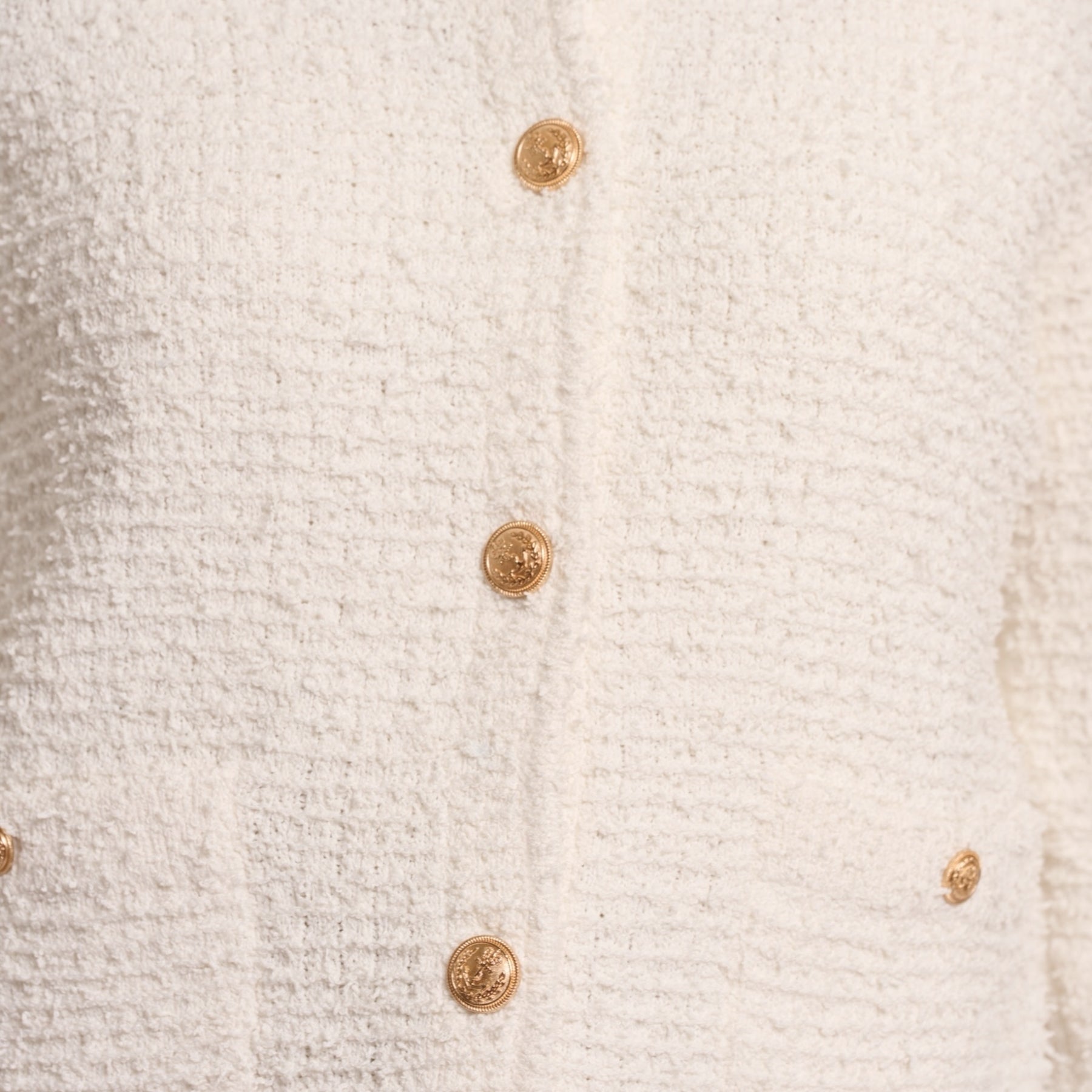 The Rino & Pelle Yamin Knitted Cardigan in Snow White is a timeless elegant knitted cardigan, designed in a boxy silhouette with a richly textured, bouclé-inspired knit. A clean round neckline and full button closure are finished with refined gold-tone buttons for a polished touch. Front patch pockets with matching button details complete the look, balancing structure with effortless sophistication.