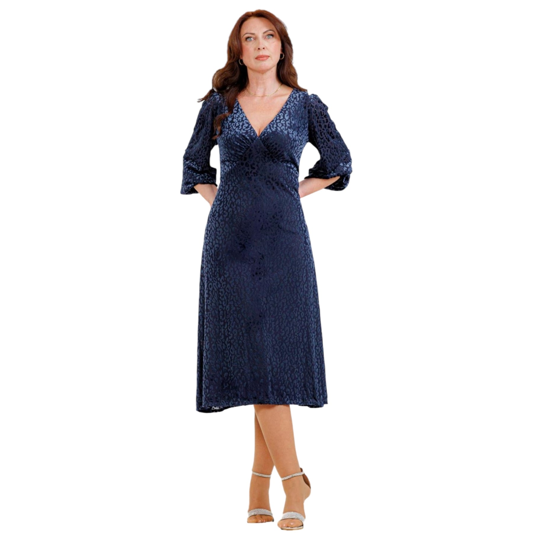 The Allison Long Sleeve Dress in Navy is a classic style dress from our new Cypriot brand Allison. This Allison dress features a V neck, fitted bodice, long sleeves and a regular fit. This dress is made from a gorgeous flowy fabric that has an animal print weave all over. The dress has a flared skirt, elasticated cuffs and is fully lined. The dress also features a button closure on the back of the neck.