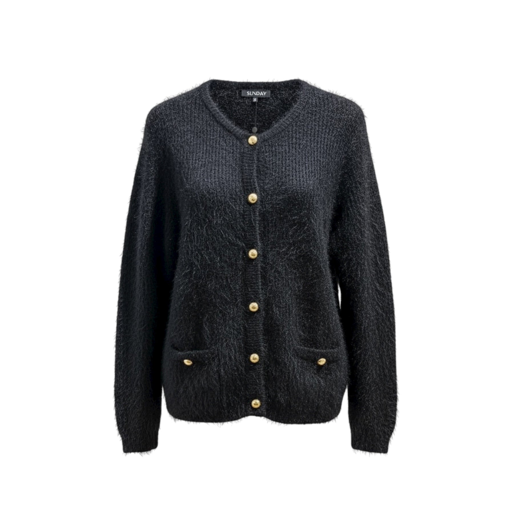 The Sunday Fuzzy Cardigan in Black is a great extra layer for colder days that will help keep you warm whilst still looking stylish. This Sunday cardigan features long sleeves, two front pockets and is finished off with gold buttons. A great cardigan for layering over tee's during the day and dresses for an evening look.